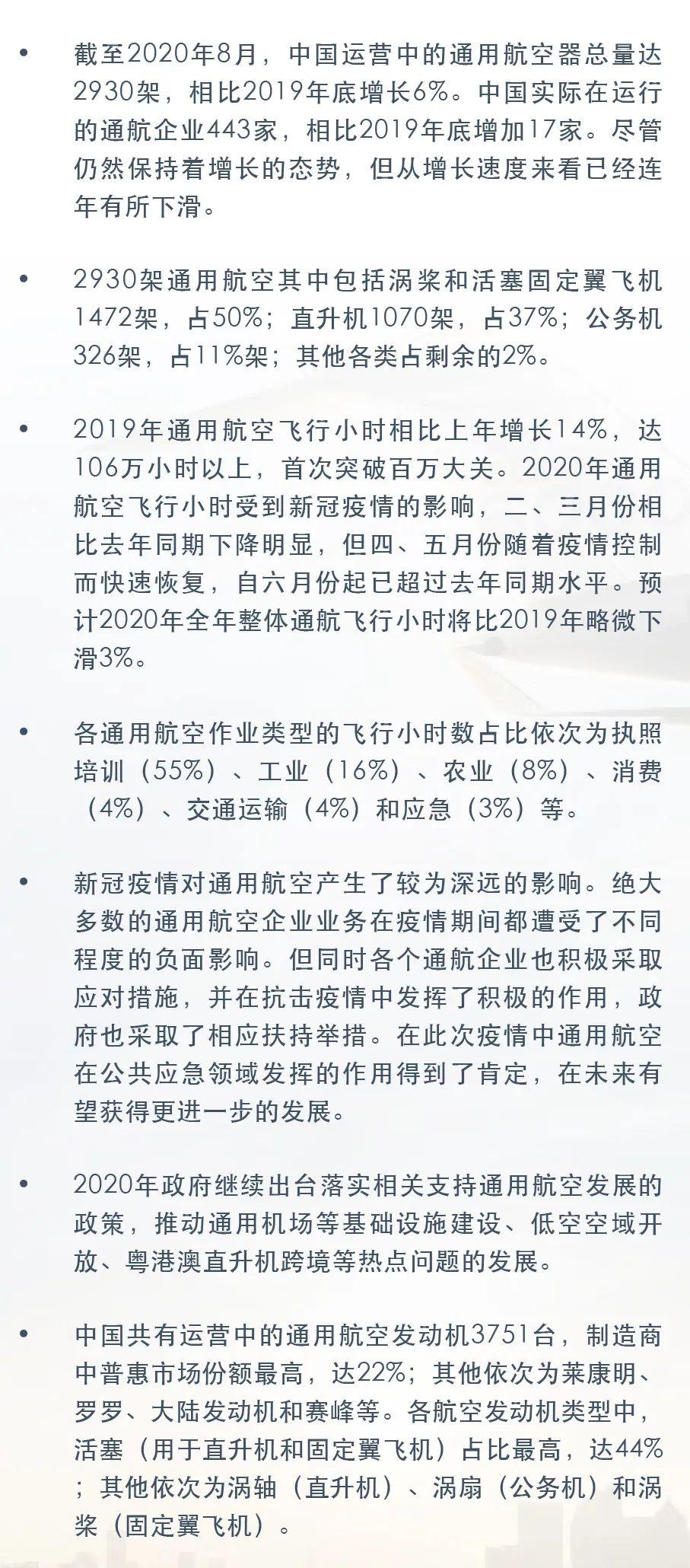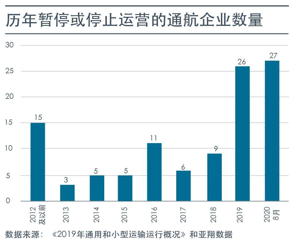从中国民航局发布的《通用和小型运输运行概况》报告中提供相 关统计数据来看,2019 年和 2020 年的暂停或终止运营的通用航空企业数量均远超之前的年份,而 2020 年前 8 个月停止运营的通用航空企业数量已超过 2019 年全年的数量。2019 年和 2020 年停止运营的通用航空企业主要为 91 部运营企 业,其中又以直升机运营企业占大多数。主要原因是市场需求仍然未得到完全释放,市场竞争加剧,从而导致淘汰率的加大,而 2020 年年初爆发的新冠疫情也给企业带来了运营和资金层面的双重挑战。同时,公务机业务的发展由于国内国际金融政治风险加剧而表现出疲软的态势,也导致了一部分以运营公务机为主的 135 部企业停止运营。