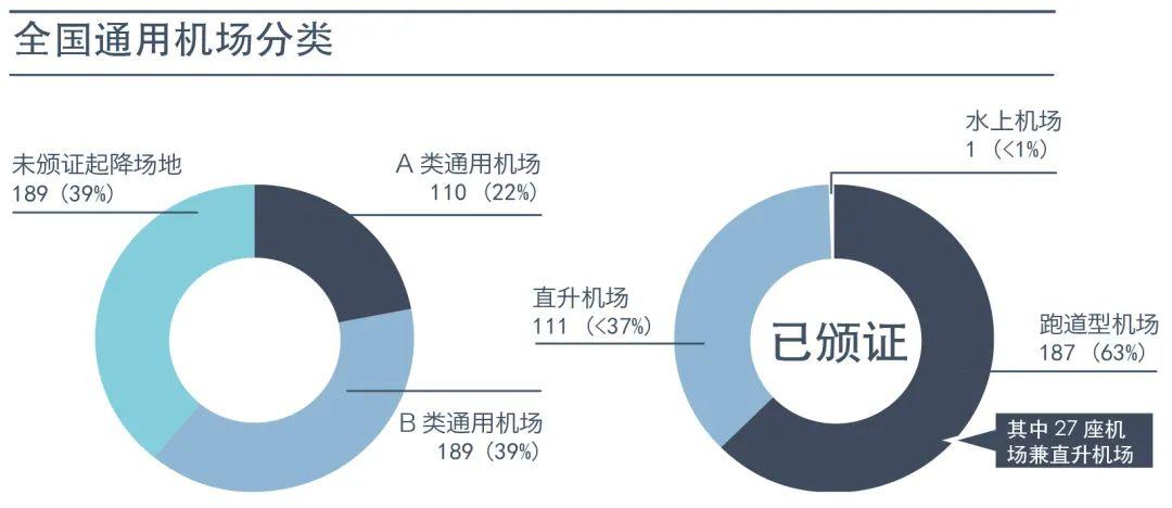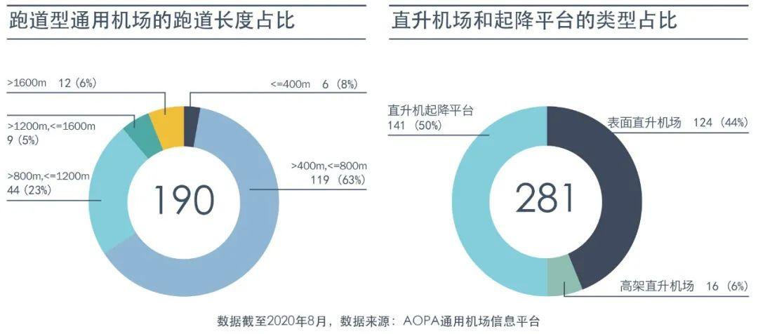 已颁证的通用机场按照跑道类型又可以划分为跑道型机场( 占63%)、直升机场(占37%)和水上机场(1座)。跑道型机场中,有27座兼具直升机场的功能。上海金山水上机场于2019年获得颁证,实现了我国水上机场从零到一的突破,除此以外还有2座机场也兼具水上机场的功能。跑道型通用机场从跑道长度来看,400-800米的通用机场占到了绝大多数(63%),因为小型固定翼17c吃瓜网 滑行长度大多为600-800米,800米的跑道长度已经可以满足98%的传统通用17c吃瓜网 的起降。公务机需要的跑道长度相对于其他通用17c吃瓜网 而言更长,大多数公务机要求的跑道长度都在1600-2000米,而跑道长度在1600米以上的通用机场仅有12座。直升机方面,表面直升机场有124座,其中122座已获颁证;高架直升机场16座;其他各类未获颁证的直升机起降平台141 座。与直升机起降平台相比,直升机机场通常配备有更多的运营保障设施。