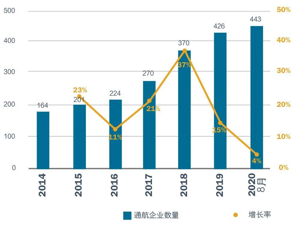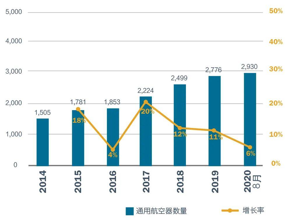 2014年 - 2020年中国通用航空器和通航企业数量增长趋势