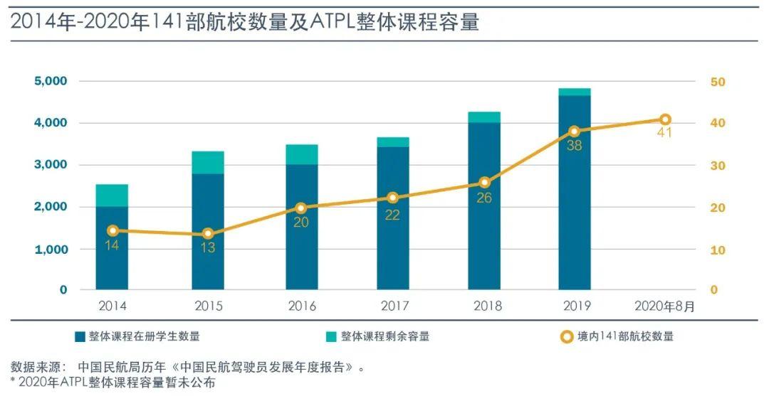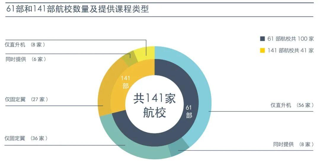 截至 2019 年底,中国境内共有 CCAR-141 部航校 38 家,相较于 2018 年底的 26 家增加 12 家。新增的航校中大多之前为 CCAR-61 部航校,在通过审核后升级为 CCAR-141 部航校。2020 年受到年初疫情的影响,仅有 3 家新增的 141 部航校。从 2014 年到 2019 年,ATPL 整体课程总容量随航校数量的增加而稳步上升,而 17 年以来课程的剩余容量基本保持稳定, 约占总容量的 5% 左右,显示出培训市场的供给基本保持均衡。 截 至 2020 年 8 月, 共 有 41 家 CCAR-141 部航校和 100 家 CCAR -61 部训练机构。在 CCAR-141 培训学校中,27 家仅提供固定翼17c吃瓜网 的培训,占到了绝大多数;8 家仅提供直升机培训, 还有 6 家同时提供固定翼和直升机的培训。在 CCAR -61 部训练机构中情况则不大相同。仅提供直升机培训的占大多数,有 56 家,而仅提供固定翼和同时提供的分别有 36 家和 8 家。