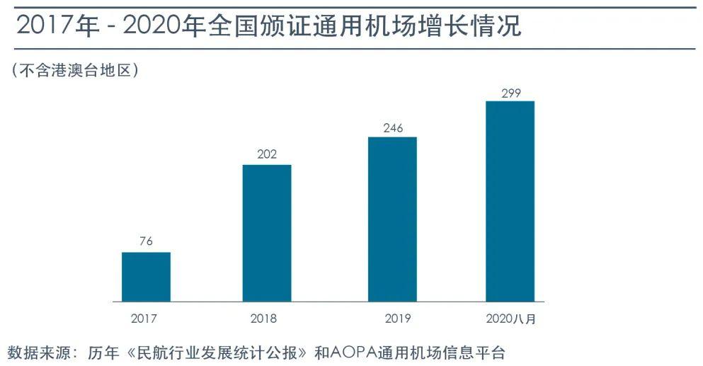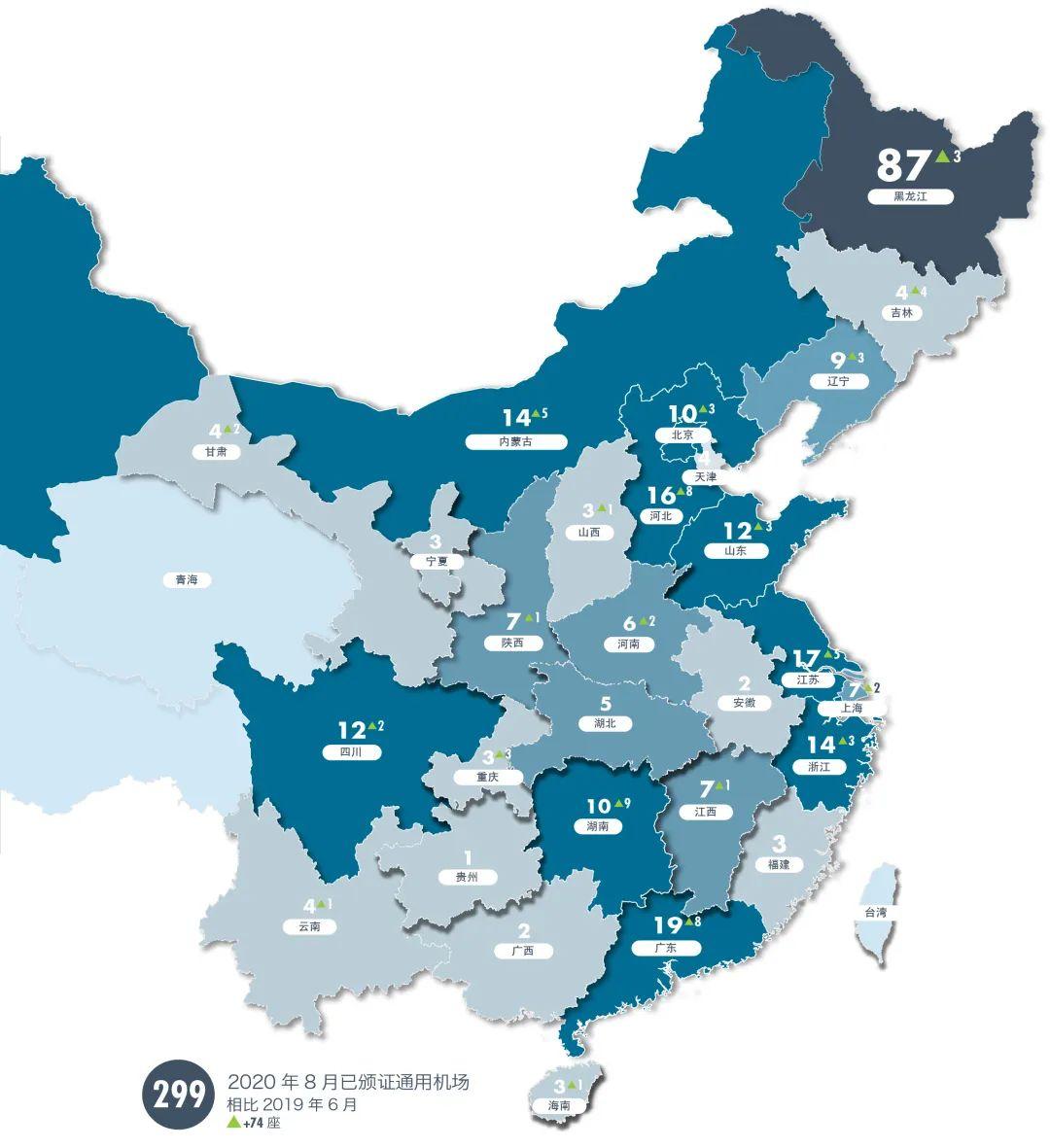 2019年和2020年中国通用机场均实现了高速的增长。截至2019年底,中国共有颁证通用机场246座,首次超过了同期公共运输机场的238座。截至2020年8月,颁证通用机场的数量来到了299座,尽管受到疫情的影响,相较于2019年底仍然保持着22%的高增长率。
