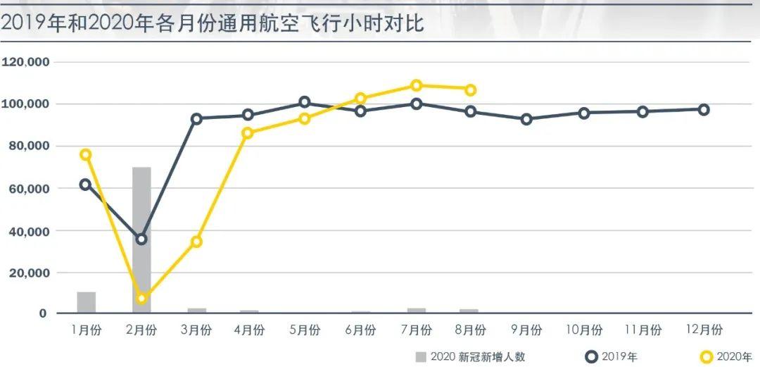 根据中国民航局每个月度的例行新闻发布会上公布的通用航空作业飞行小时数据来看,2019年整体的通用航空作业呈现出非常明显的时间性和季节性,受到天气和农历新年的影响较大。2020 年1月通用航空飞行小时相比于2019年同期仍上升了18%,这主要是因为疫情初期产生了大量的包机出行的需求,而旅行限制的相关措施也尚未落实。而随着 2 月份反映为新增新冠病例人数快速上升的疫情在国内的全面爆发,国家出台相关的旅行限制措施并推迟农历新年后的大部分行业的开工,通用航空的飞行作业时间跌至冰点,仅为 2019 年同期的约10%。而这其中又大部分是通用航空参与抗击疫情工作,主要表现为医疗物资和人员的运输,以及空中巡查、航空喷洒消杀和航拍航摄。自3月份以来,随着疫情在全国范围内基本得到了有效的控制,复工复产进展顺利,通用航空飞行作业开始快速复苏,4 月份的通用航空飞行作业小时数已经恢复到了 2019 年同期的 90% 以上的水平。5月份新冠疫情已经得到了全面的控制,仅在少部分地区仍有新增病例的出现,全国当月的新增病例人数不足 200 人。通用航空作业小时数在6月份实现了对 2019 同期水平的反超, 并在7、8月份进一步拉开了差距。