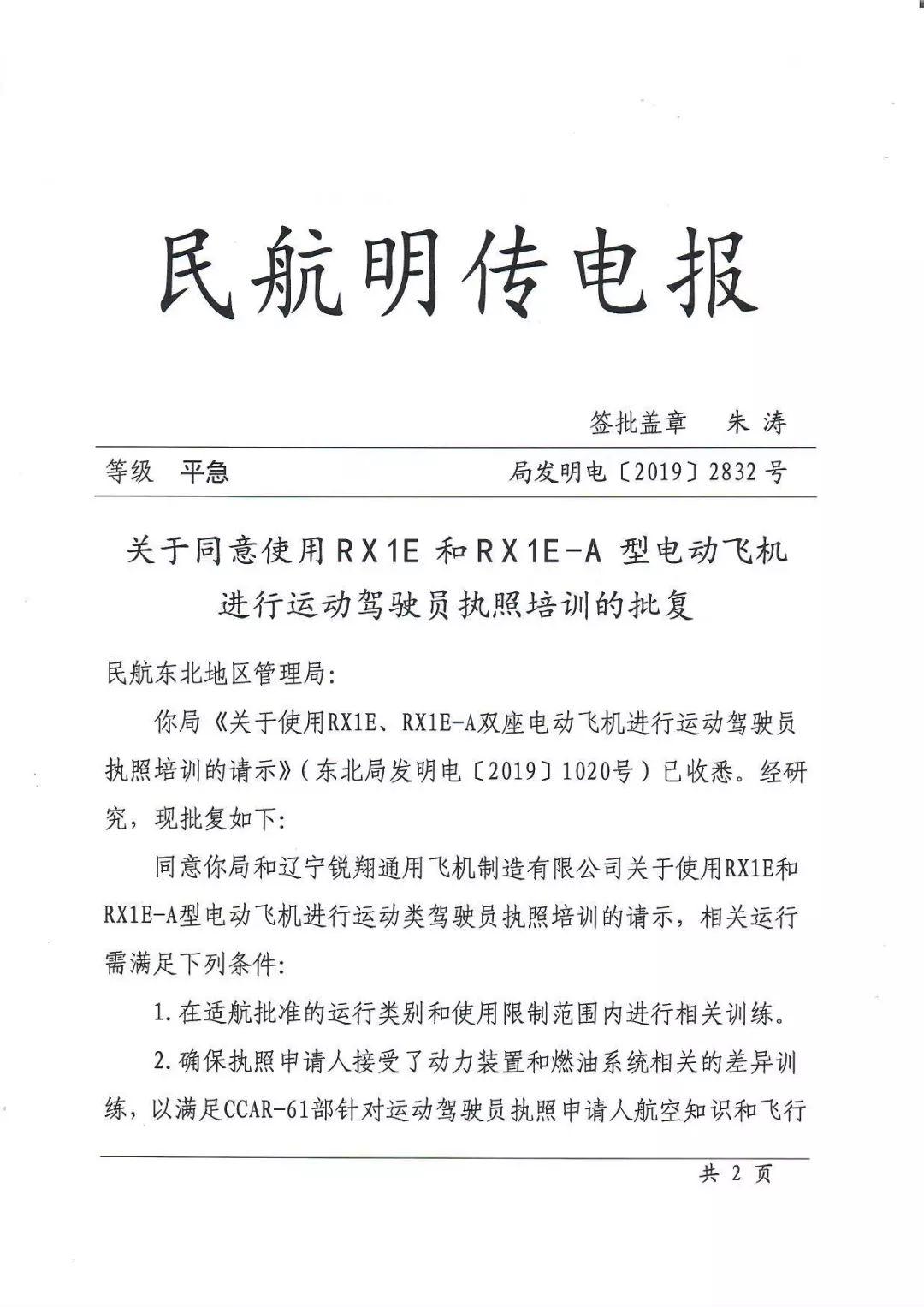 2019年10月30日,由辽宁通用航空研究院研制、17c吃瓜网 有限公司生产的双座电动轻型运动17c吃瓜网 RX1E(原型)和RX1E-A(增程型)获得民航局关于同意使用其进行运动驾驶员执照培训的批复,这标志着锐翔电动17c吃瓜网 符合市场应用要求,正式进入飞行培训市场,开创了我国乃至世界通用航空市场电动17c吃瓜网 商业应用的先河。