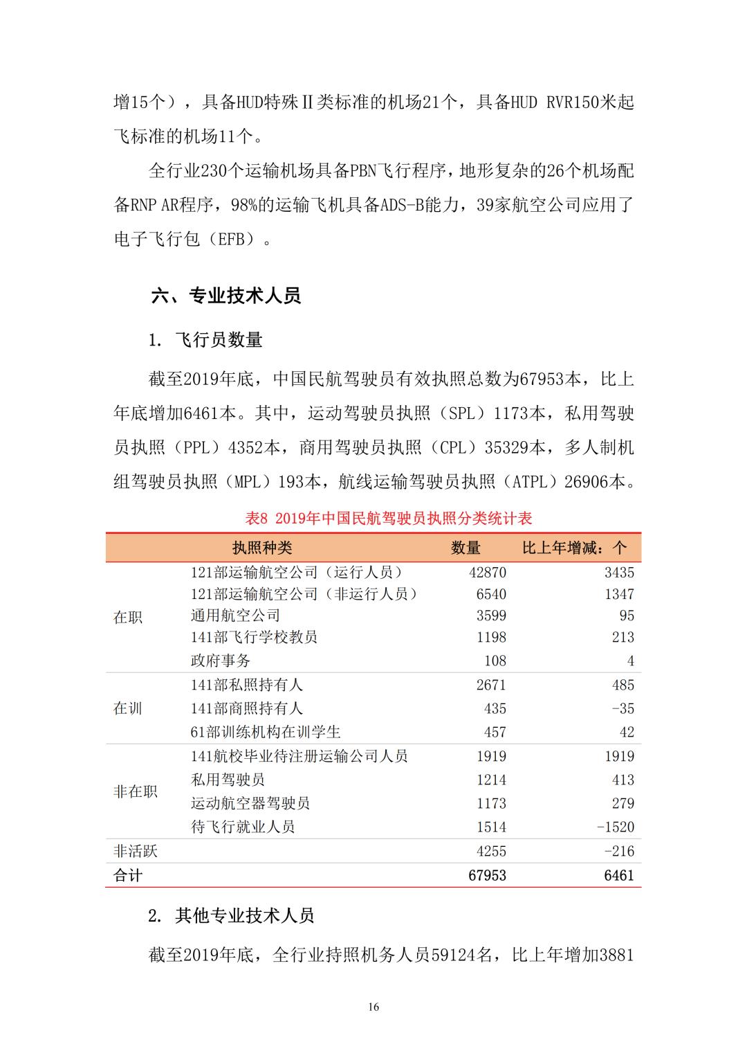 截至2019年底,中国民航驾驶员有效执照总数为67953本,比上年底增加6461本。其中,运动驾驶员执照(SPL)1173本,私用驾驶员执照(PPL)4352本,商用驾驶员执照(CPL)35329本,多人制机组驾驶员执照(MPL)193本,航线运输驾驶员执照(ATPL)26906本。