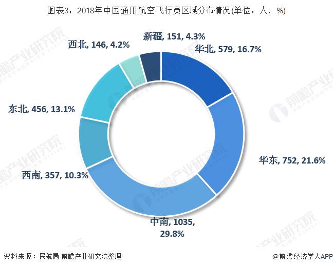 根据中国民航局2019年2月13日发布的《2018年通用和小型运输运行概况》数据,截止2018年底,我国从事通用及小型运输的飞行员,总计3476人,其中华北地区579人、华东地区752人、中南地区1035人、西南地区357人、东北地区456人、西北地区146人、新疆地区151人。