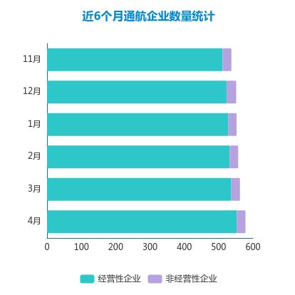 根据相关统计,截至2021年4月30日,全国共计578家通用航空企业,企业数量同比增长9.1%,环比增长2.8%。其中经营性企业553家,非经营性企业25家。通用航空企业数量变化趋势总体平稳。